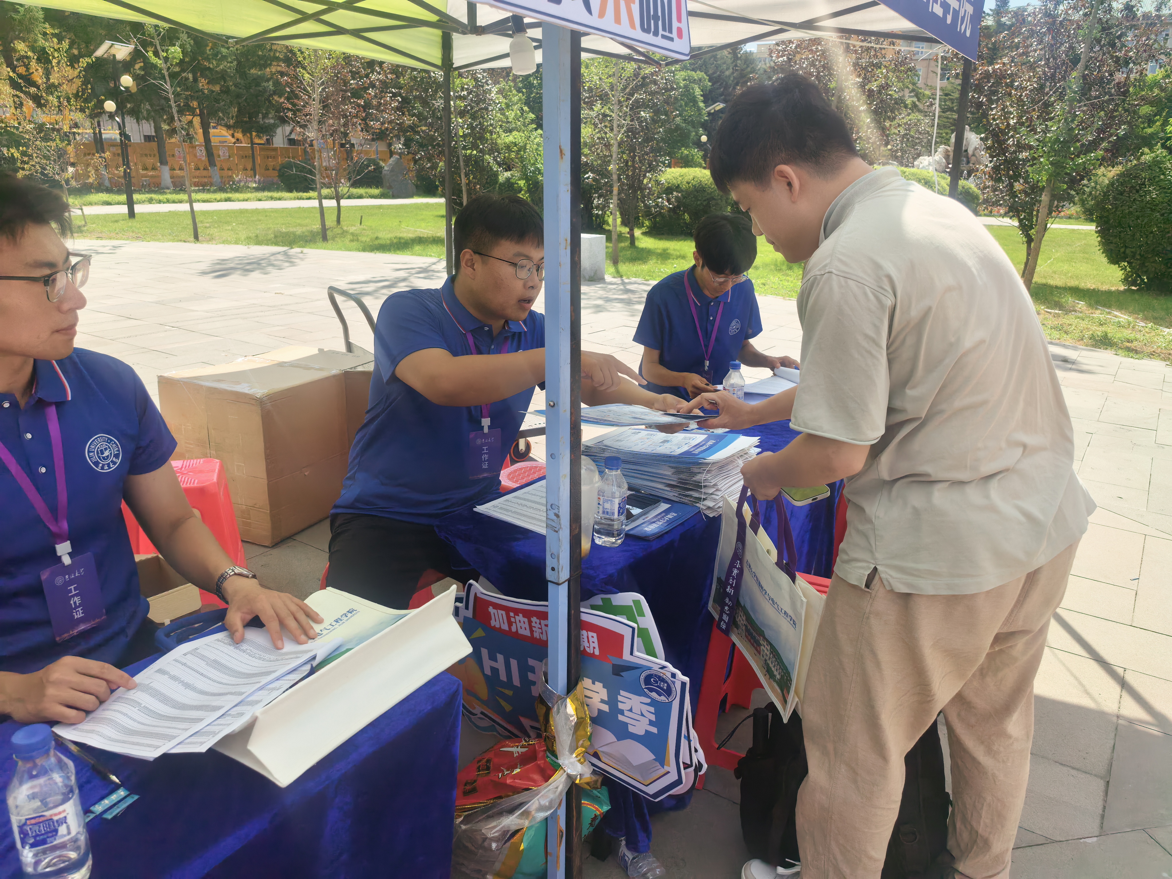 8月19日是正式报到的前一天,各位志愿者认真布置迎新场地,公司党委副书记丁世海老师现场指导工作。丁书记叮嘱各位老师和志愿者要积极营造“文明、有序、高效、温馨”的迎新氛围,将迎新各项工作落实落细。