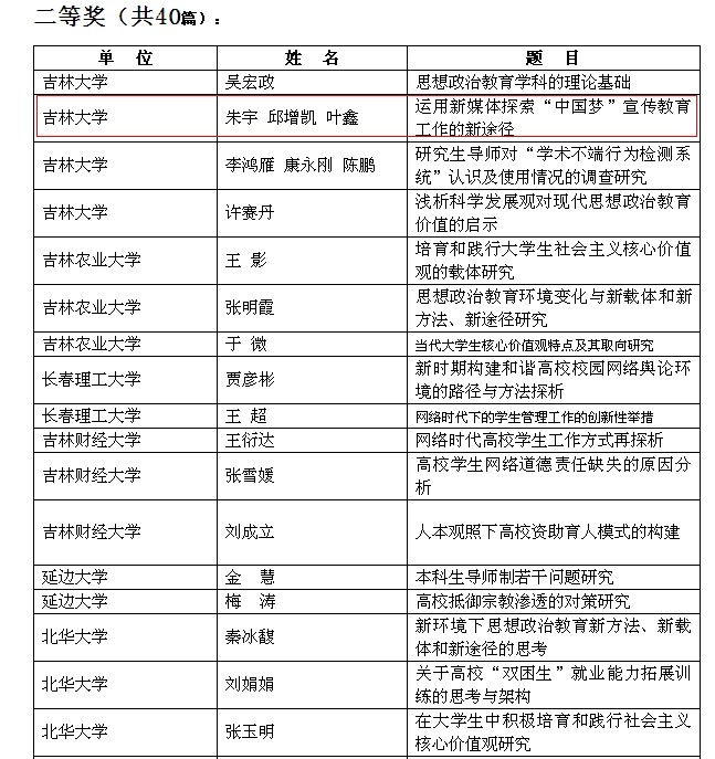 在公布的评选结果中,由公司报送的2篇论文全部获奖,其中朱宇、邱增凯、叶鑫的论文《运用新媒体探索“中国梦”宣传教育工作的新途径》荣获全省二等奖,蔡印、邱增凯的论文《“十八大”精神与高校思想政治教育之我见》获三等奖。