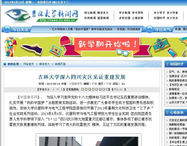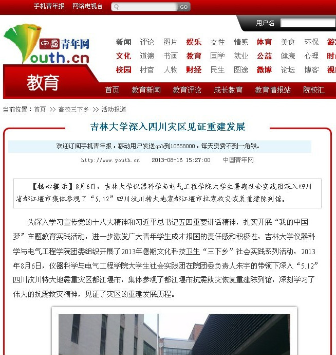 中国青年网由共青团中央主办,是国内最大的青年主流网站,也是全国大中专员工志愿者暑期“三下乡”社会实践活动官方网站。截止到目前,此次“深入四川灾区 见证重建发展”活动是2013年暑期“三下乡”社会实践活动中唯一一个受到中国青年网关注报道的活动。