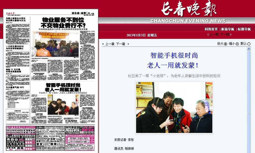2. 长春晚报《智能手机很时尚,老人一用就发蒙——社区来了一帮“小老师”,为老年人讲解生活中的科技知识》http://ccwb.1news.cc/html/2013-05/03/content_309971.htm