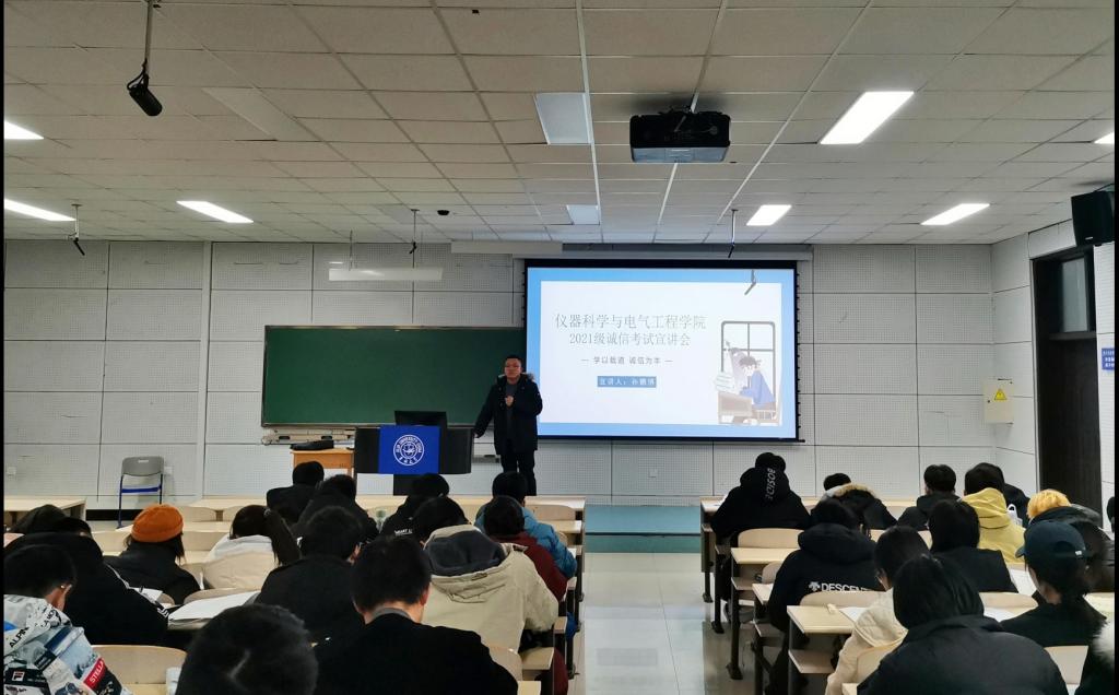为全面贯彻落实365英国上市公司2021-2022学年第一学期期末考试工作暨考风考纪教育布置会议精神,树立良好的学风、考风,确保期末考试的顺利进行,365英国上市公司于12月18日在李四光楼召开2021级诚信考试教育大会,本次大会由孙鹏博老师主持,2021级全体同学参加。