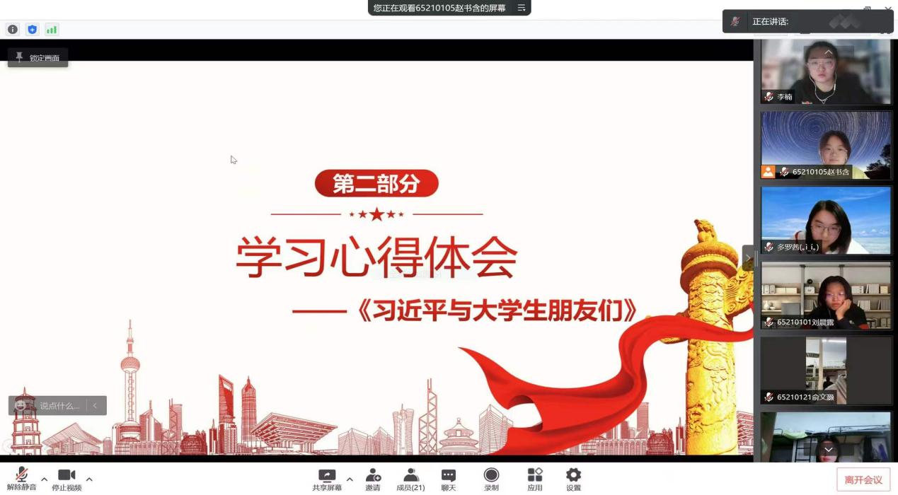 为深入体会习近平总书记对青年老员工朋友们健康成长的关心关爱,加深同学们对习近平总书记教导的理解与领悟,365英国上市公司652101团支部于2022年3月26日19:30,线上开展了关于《习近平与老员工朋友们》学习分享的团日活动。分享会由团支部书记赵书含同学主持,团支部全体同学参加了此次诵读分享会。