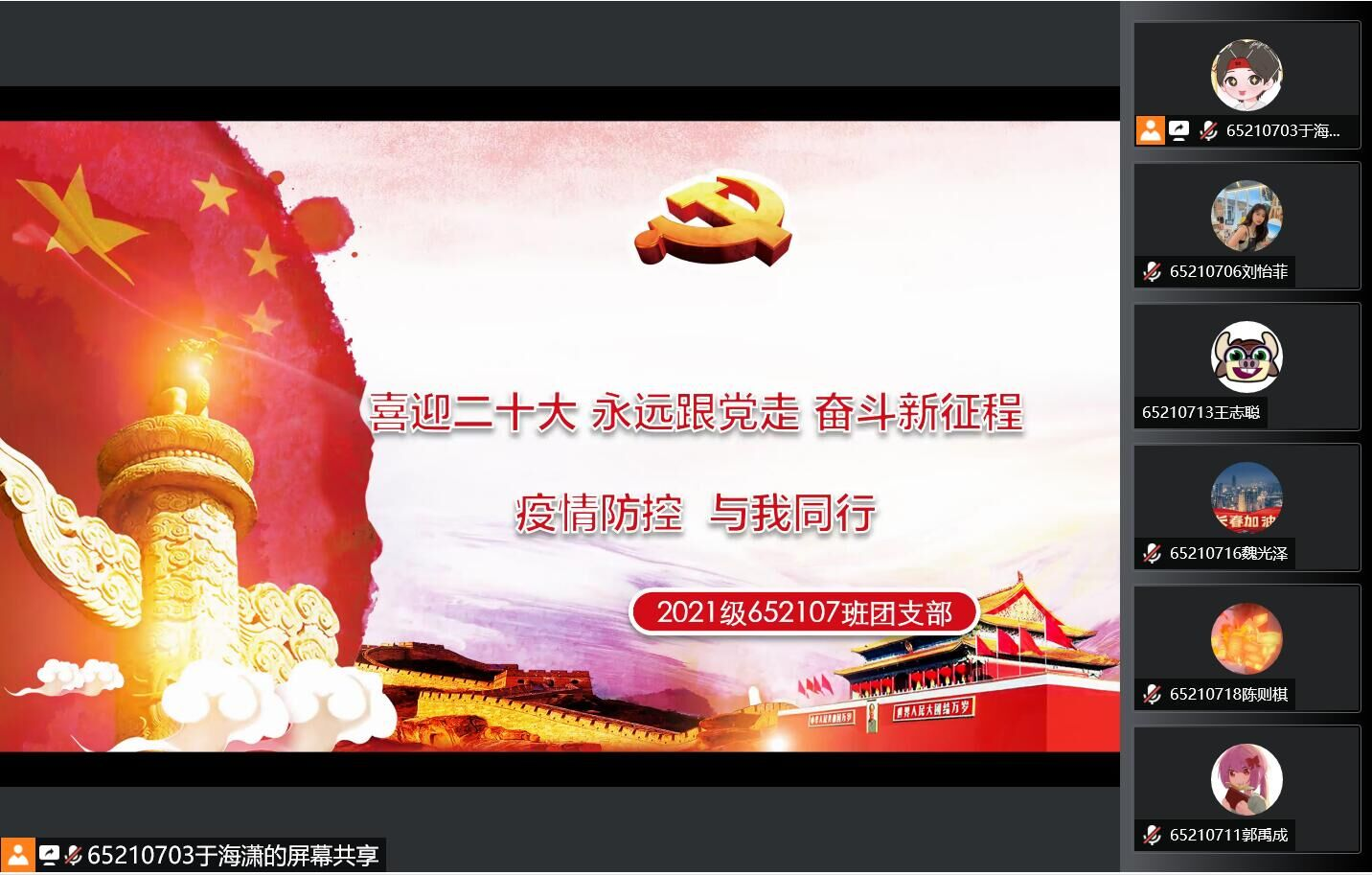 为响应全面贯彻党的十九大和十九届历次全会精神,深入学习习近平总书记关于青年工作的重要思想,365英国上市公司652107团支部于2022年4月13日10:00,线上开展了以《喜迎二十大、永远跟党走、奋斗新征程》为主题的团日活动。本次活动由团支部书记于海潇主持,支部全体同学参与了本次活动。