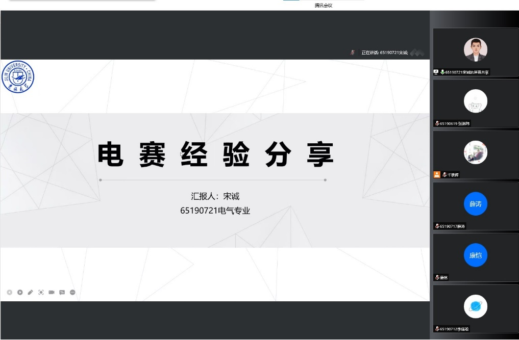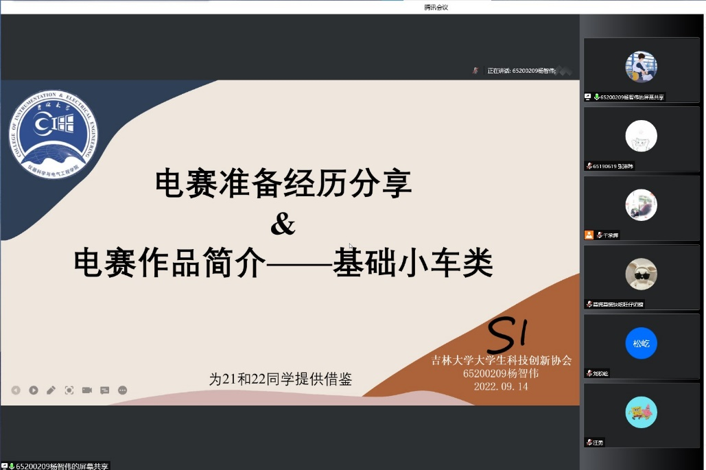 现科协外宣部成员杨智伟以基础小车类电赛作品为侧重,分析其中的知识点和设计点,给21和22级同学提供了许多非常具体的学习实操建议。科协科技部长薛涛则讲解了很多与电赛有关的知识“干货”,以“旋转倒立摆”的设计为例教同学们建立起电赛设计的基础思维。李佳凇和宋诚又进一步分享了如何完成一个电赛项目,包括赛前所需的准备,电赛期间如何更合理地规划时间,赛后的优化总结等。