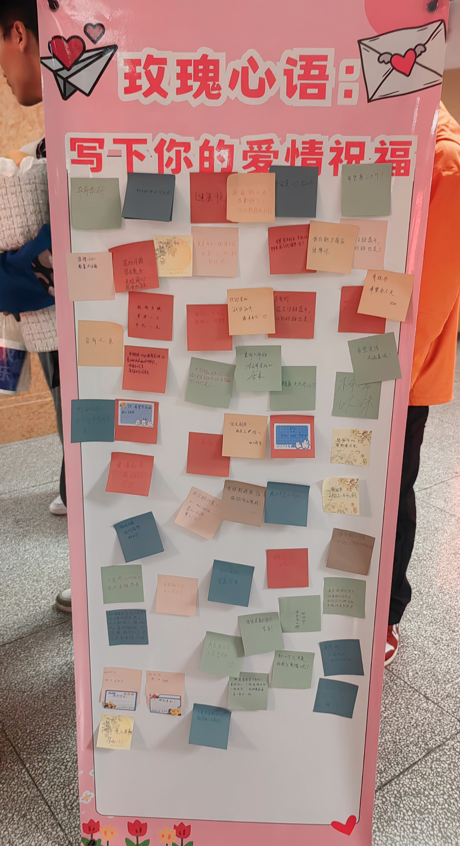 随后,同学们在美丽的玫瑰花旁,写下对爱的理解与祝福,并将其挂在活动现场的“爱情祝福展板”上。现场氛围温馨而感人,大家纷纷表示,希望在未来能够更好地理解自己和他人,将弗洛伊德的爱情观运用到日常生活中。