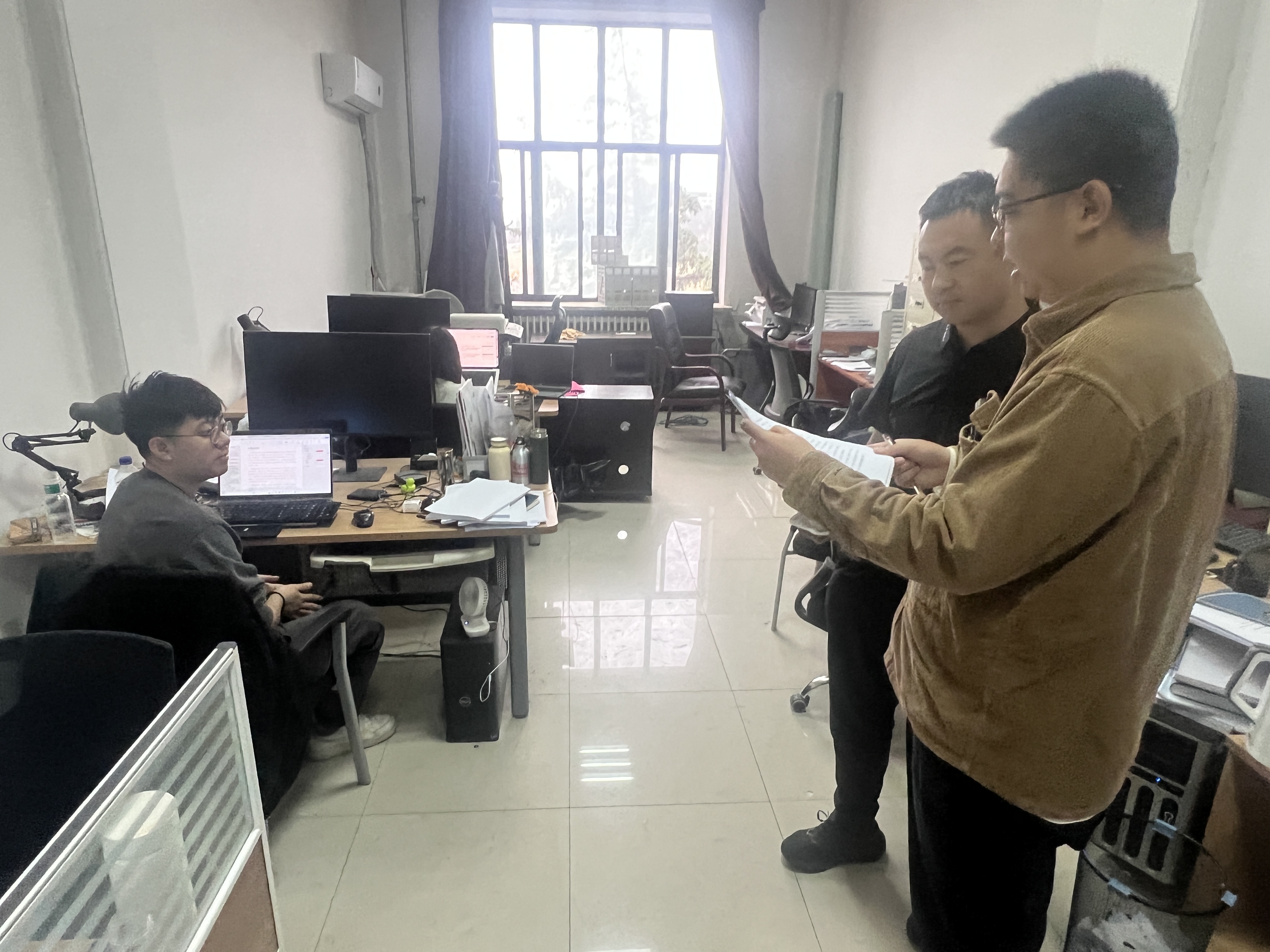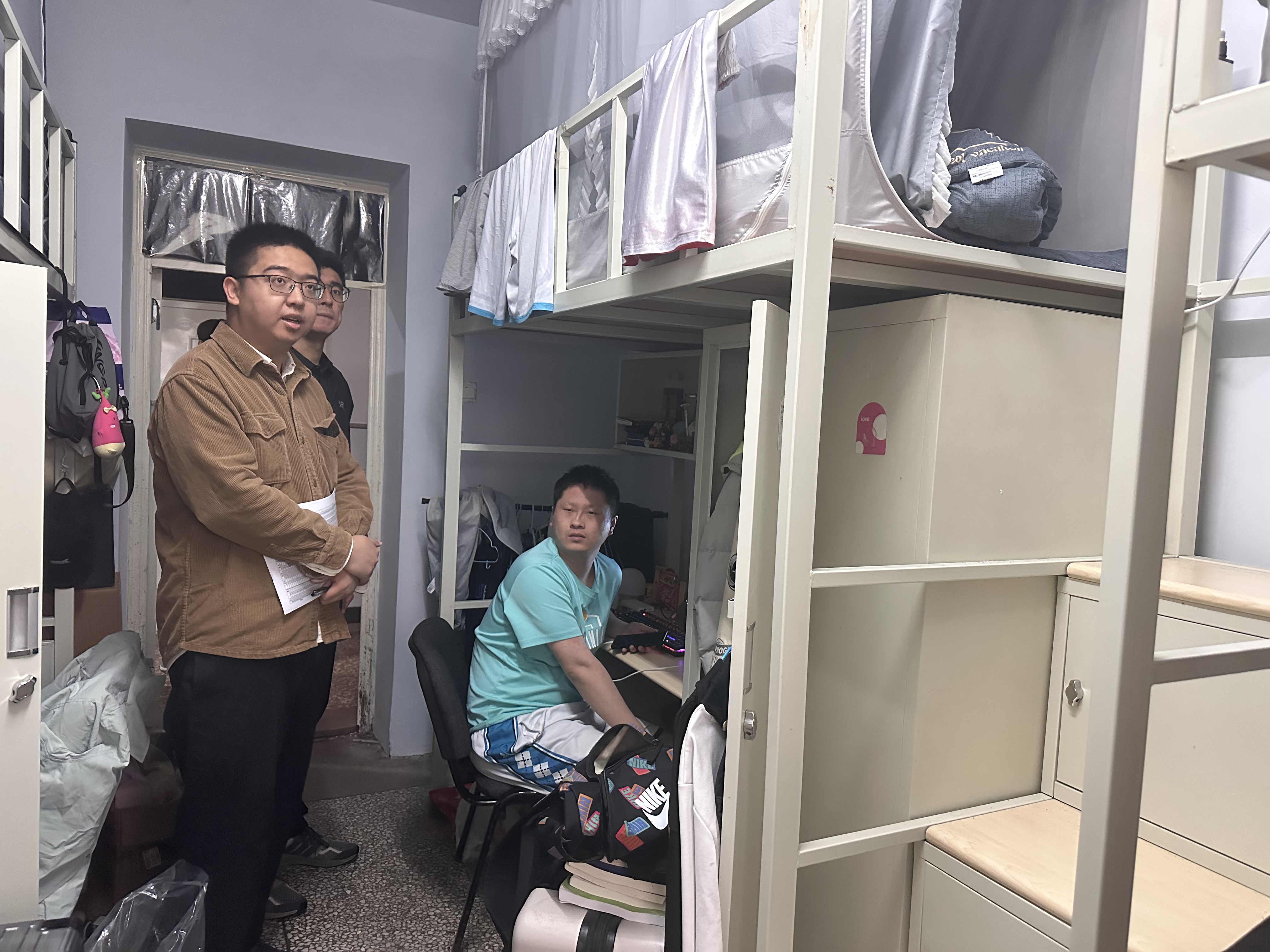 在朝阳校区地质宫各实验室,各位辅导员与研究生导师、本科生毕业设计导师深入交流,强调实验室用电安全,了解研究生及本科毕业生的科研及毕业设计进展情况,现场为学业困难员工制定帮扶方案;在员工寝室,各位辅导员针对寝室卫生状况、电源插座使用规范、电器设备合规性等进行认真细致排查,并建议同学们勤通风、常打扫,共同维护整洁有序的居住环境;提醒大家合理规划学习时间,注重劳逸结合,以良好状态迎接期末考试。