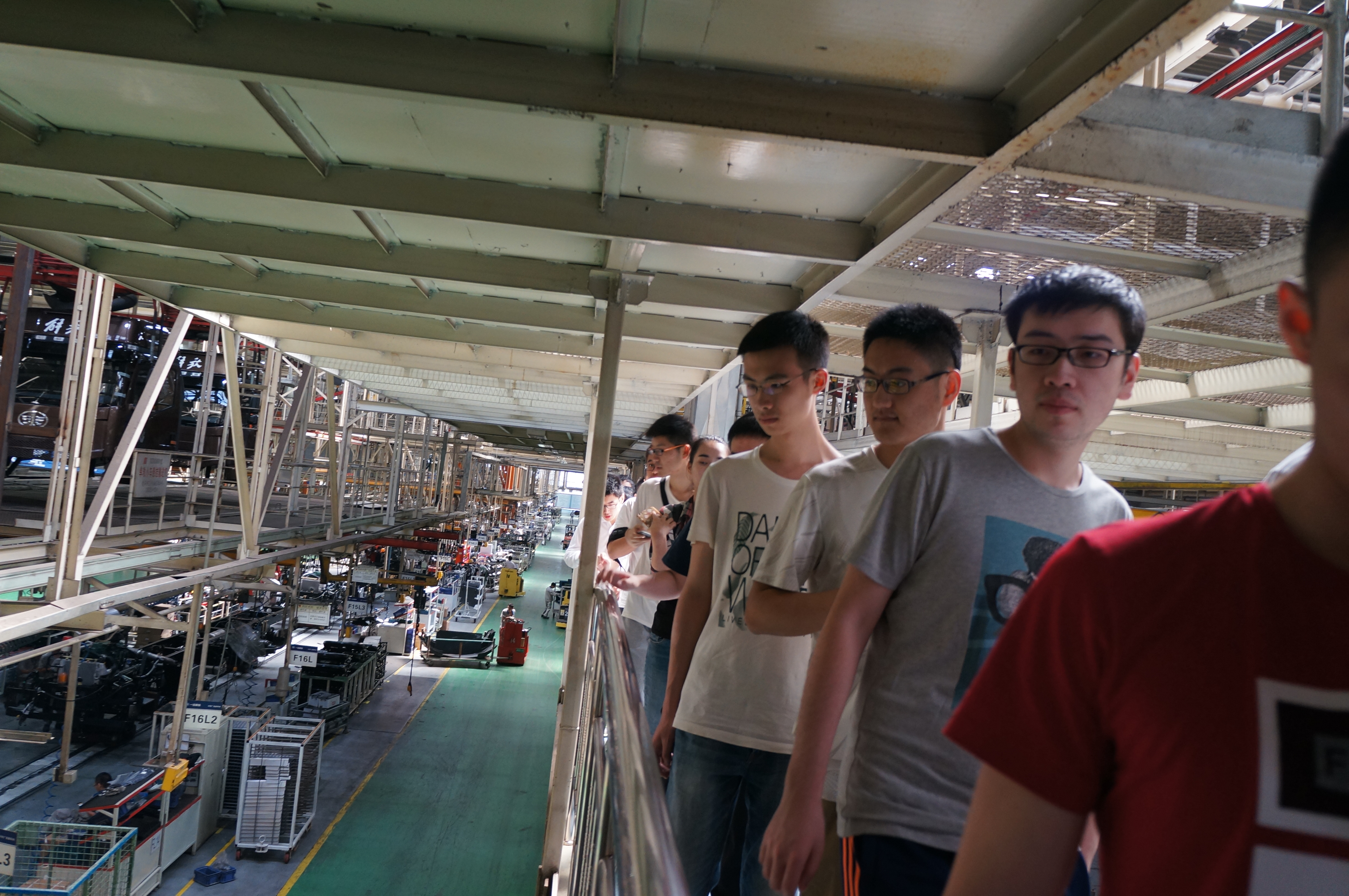 同学们就早早的在地质宫楼下集合,虽然起了个大早,但是同学们依旧神采奕奕,大家表示对此次一汽解放汽车有限公司的参观充满期待。集合完毕后,同学们乘坐校车向一汽解放公司出发。路途遥远,途中带队老师向同学们简单的介绍了此次参观的内容,并提醒大家要重点参观学习与专业有关的部分。经过40分钟的路程,同学们抵达一汽解放公司制造厂,在相关人员的带领下前往解放制造工厂。一汽的主干道上运货车辆络绎不绝,司机师傅们高速地进行作业,在保证高效的同时又显示出严格的秩序,保证高效安全无事故。来到一汽解放总装车间,同学们来到参观专用通道,从上方观察解放汽车的总装过程,这包括了20余个车间,裸车放置在传送带上,直线流水作业,每一道工序有若干人负责,并配有机械手等辅助工具,较高的现代化程度使得整个装配过程效率非常高。