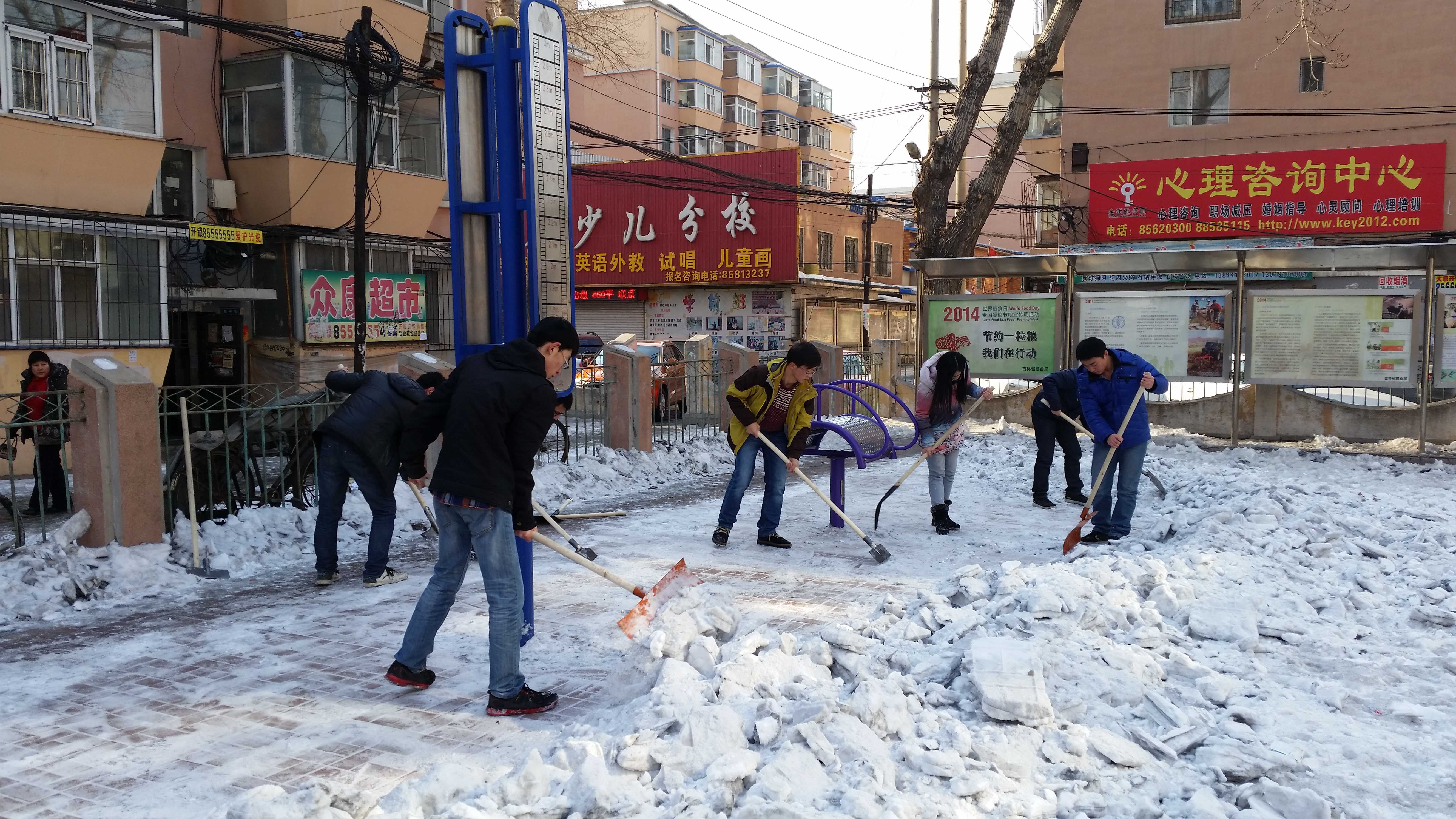 为深入贯彻落实习近平总书记系列重要讲话精神和李克强总理致公司白求恩志愿者回信精神,进一步弘扬雷锋精神和“奉献、友爱、互助、进步”的志愿者精神,组织引导广大青年员工在深入社会、了解国情、接受锻炼的过程中培育和践行社会主义核心价值观,让志愿服务成为每个吉大人的生活方式,让志愿者成为365英国上市公司最响亮的名片,2015年3月5日下午,365英国上市公司团委“牵手”青年志愿者协会志愿者在指导教师张昊宇的带领下走进朝阳区清和街道南昌社区开展义务除雪除冰活动。