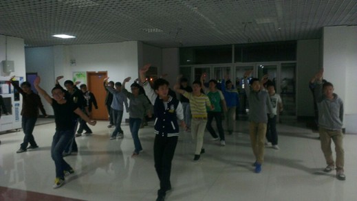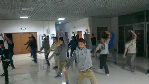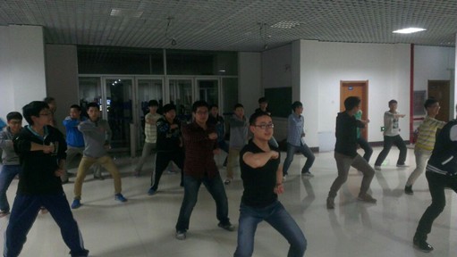 紧张有序的训练在每天19:00拉开序幕,首先,由2012级参加上届运动会三路长拳比赛的学长向队员们讲述动作要领,并通过亲身示范形象地展示细节上需要注意的方面。随后,在学长的带领下,全体三路长拳团队队员整齐划一地列好方阵,认真进行了多达十余次的整套动作的演练。在紧凑有力的伴奏声中,每一位队友都热情满满,毫不懈怠,力求把每一个动作做到精准到位,虽然训练量大,但没有一个队员喊苦叫累,团队凝聚力得到了充分的彰显。每次训练历时一个多小时,最终在团队队友相互分享动作心得的交流沟通中落下了帷幕。