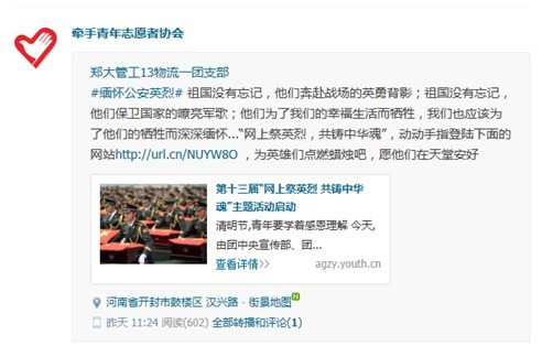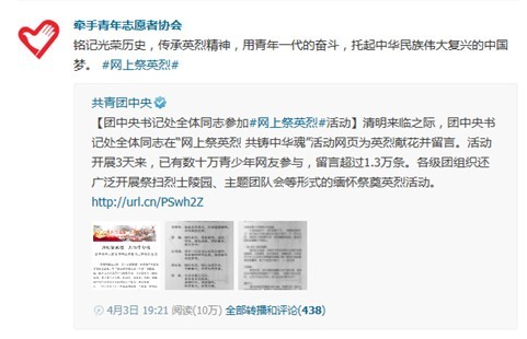 微博祭英烈 共铸中华魂——“牵手”青年志愿者协会开展清明节纪念活动