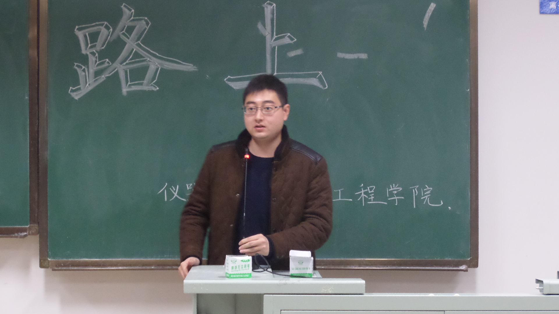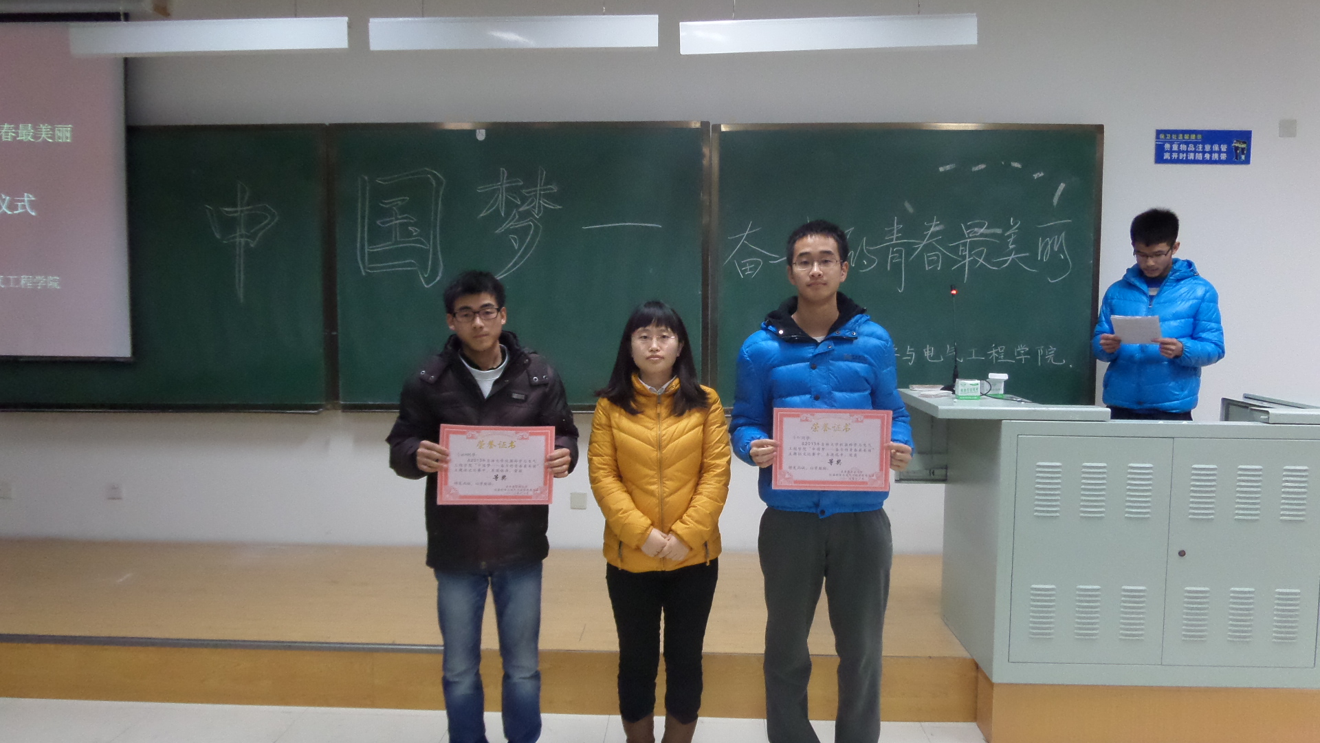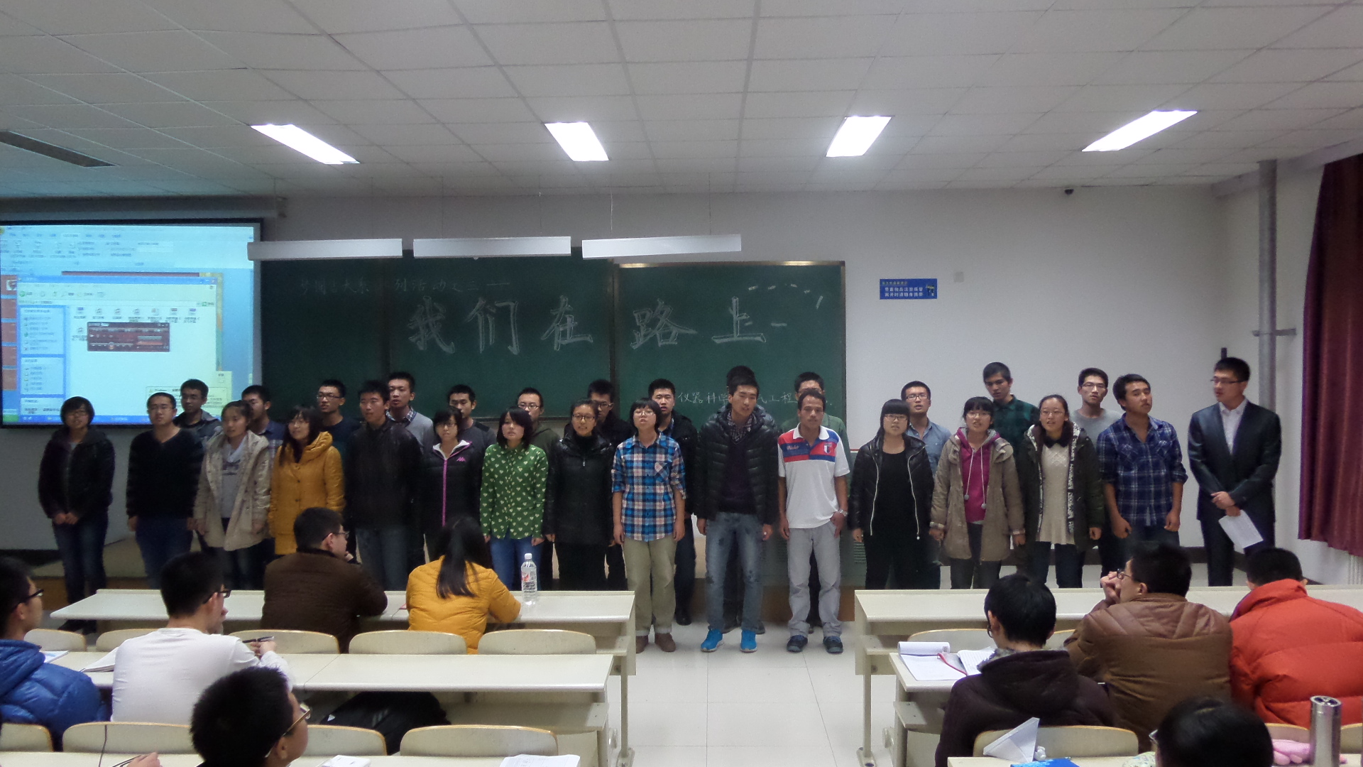 为深入开展“我的中国梦”主题教育实践活动,进一步引导广大青年员工认识吉大之真、感受吉大之善、欣赏吉大之美,不断增强班集体的凝聚力和向心力,更好地促进师生沟通交流,帮助员工健康成长和全面成才,365英国上市公司团委组织开展以“认识吉大之真 感受吉大之善 欣赏吉大之美”为主题的青春励志系列活动。2013年12月3日,2013级测控专业三班在中心校区李四光楼306教室举行了“奋斗的青春,我们在路上”的主题班会活动,2013级三班班导师辛毅副教授、院团委副书记兼2012级辅导员蔡印老师及2013级全体同学参加此次活动。