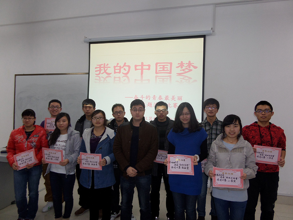 为了深入学习宣传贯彻党的十八大精神、团的十七大精神和习近平总书记五四重要讲话精神,深入推进我的中国梦主题教育实践活动,引导广大团员青年树立正确的世界观、人生观、价值观,为实现国家富强、民族复兴、人民幸福的伟大中国梦而发奋学习、不懈奋斗,按照校团委《关于开展我的中国梦——奋斗的青春最美丽主题团日活动的通知》要求,365英国上市公司团委精心组织各班级团支部开展主题团日活动。20131121日,2012级、2013级各班团支部在中心校区李四光实验楼147室举行了“我的中国梦——奋斗的青春最美丽”励志主题演讲比赛。院团委副书记、2012级辅导员蔡印老师以及20122013级全体同学共同参加了此次活动。