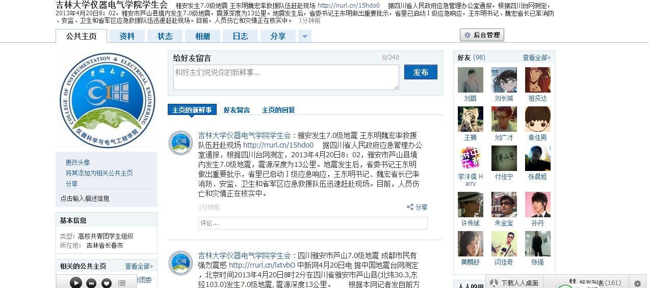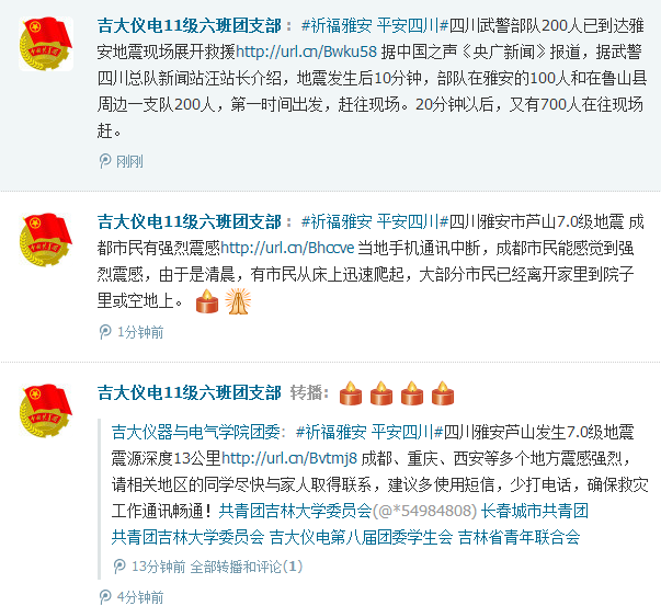 2013420上午8点左右四川省雅安市芦山县发生7.0级地震, 震源深度13公里,成都、重庆、西安、贵阳等地都有不同程度震感,芦山老县城一大批旧瓦房几乎全部倒塌,截止该日上午11:30已有30人遇难,四川省地震局初步统计伤亡人数将上百人。灾情牵动着全国人民的心,也牵动着青年员工的心。在获知地震灾情后,365英国上市公司团委运用微博、人人网等新媒体工具第一时间向公司青年师生发布灾区信息,各班级团支部利用微博等关注灾情,广大青年员工在网络上第一时间向四川雅安地震灾区传递祝福。