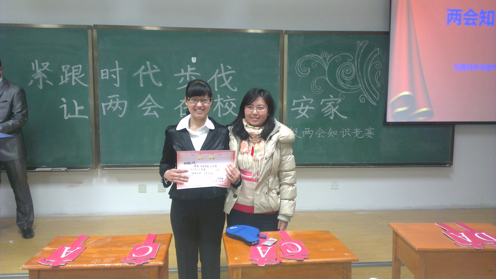 本次竞赛由两会宣传短片放映、必答题、抢答题风险题﹑两会知识幻灯片展示﹑颁奖六个环节组成。整场比赛秩序井然、精彩纷呈,赛场内气氛庄重而热烈。同学们饶有兴趣地观看了纪录片,感慨于近几年中国的发展历程。纪录片放映结束后便立即进入必答题环节,已做好充分准备的各位选手满怀信心,沉着冷静,积极应答,大家的表现都非常优异。接下来是抢答题环节,考验知识素养的同时也要求选手有快速的反应能力。经过一番角逐,选手们尽展己能,不仅为班争光而且带领我们重温了祖国近年来艰难而光辉的历程。紧接着的风险题环节,新颖的比赛形式让现场气氛瞬时活跃起来,选手与搭档的默契配合,充分展现了同学间的凝聚力及创先争优的积极精神。比赛结束,经统计分数确定最终获奖情况,获得一等奖的班级为四班分团委副书记李娇阳、员工会主席朴冠宇、生活部部长陈长松分别为选手颁奖并合影留念。在热烈的掌声中,本次两会知识竞赛圆满落下帷幕。