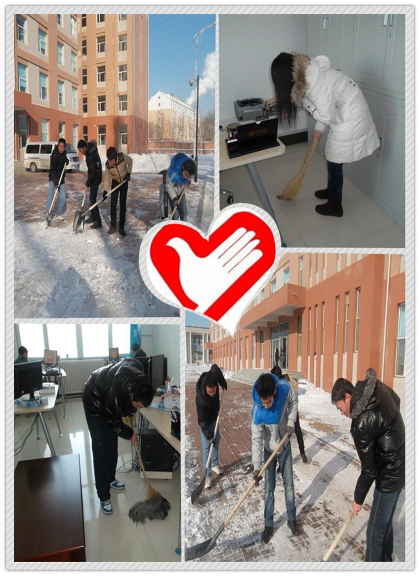 本次活动内容为:两部门2011级全体副部为中心校区基础园区一公寓和李四光教学楼门前清扫积雪和志愿者服务部2012级夏争辉、宁红扬两位志愿者同学为2012级新生辅导员打扫办公室两部分。12月5日13:30,社会实践部和志愿者服务部2011级全体副部长分别在李四光楼和基础园区一公寓门前集合,大家领取完扫雪工具后便立即开始了积雪清扫工作。由于条件的限制,公司配备的除雪工具仅仅是几把铁锹,加上五六级的寒风和零下二十度的寒冷气温,使除雪工作更加艰难。一开始,志愿者们脸和手脚都冻得通红,嘴里呼出的热气一下子就凝成了水雾,可是大家仍发扬吃苦耐劳、顽强拼搏的精神,团结协作,顶着寒风,咬牙坚持,将宿舍楼和教学楼外的积雪清扫干净。他们热火朝天、干劲十足的扫雪身影也感染了路过的同学,大家纷纷表示赞许。经过一个小时的奋战,此次扫雪任务圆满完成,虽然室外气温很低,但是大家劳动的热情,团结的力量让这个冬日变得格外灿烂和温暖。与此同时,志愿服务部2012级两名同学准时来到李四光楼203辅导员办公室,帮助新生辅导员蔡印老师打扫办公室。他们两位合理分工,埋头苦干,拿起抹布、笤帚等清洁工具对办公室的门窗、地面、桌椅、墙角等卫生死角进行了全面彻底的打扫和清理,活动过程中,他们不怕苦、不怕累,经过一个小时的劳动,顺利完成了大扫除任务,使办公室整洁卫生、焕然一新,两位同学的辛勤劳动也获得了大一导员蔡印老师的高度认可和鼓励。