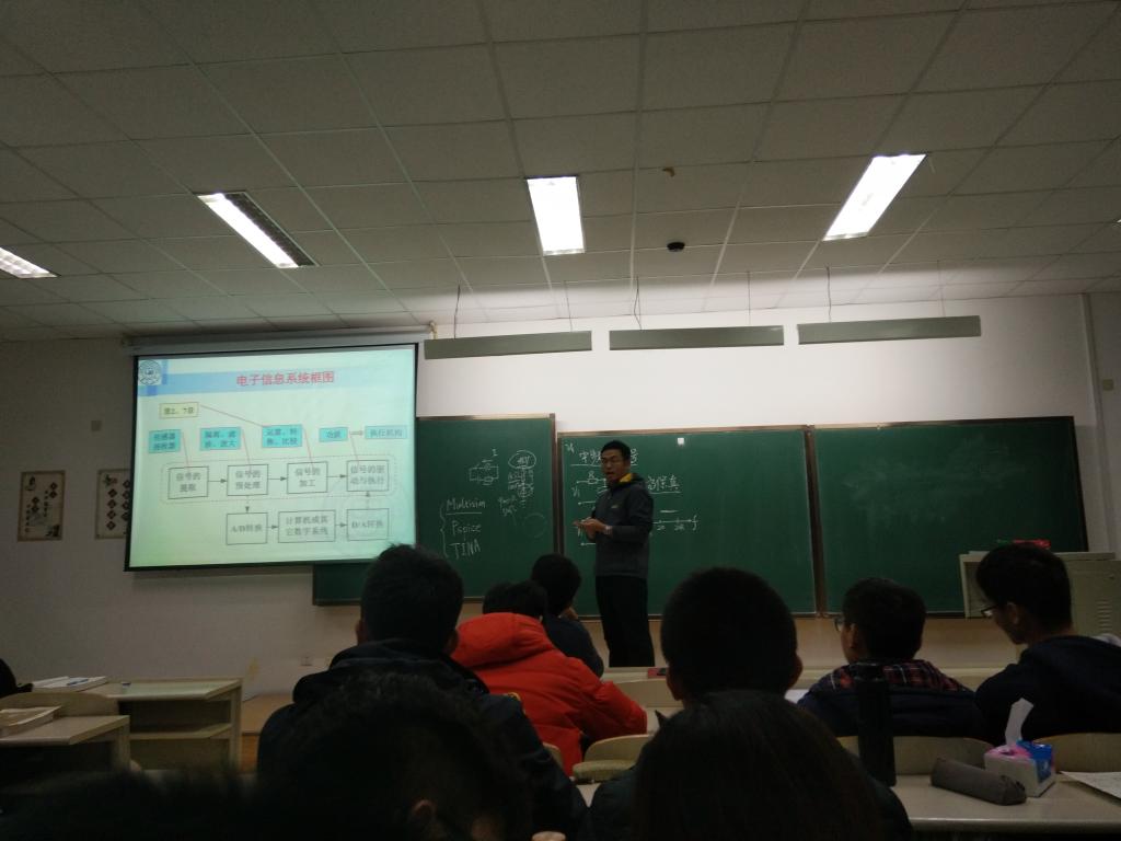 首先,周志坚老师向2016级同学讲解了模拟电子技术的课程内容和应用领域。周志坚老师通过实例用诙谐幽默的语言引导同学们思考生活中的现象,让同学们了解模电在实际生活中的应用,参加培训的同学认真听讲,积极回应参与交流,教室内不时传出爽朗的笑声。接下来,周志坚老师在讲解信号传输过程时,通过举例耳机在20Hz至20000Hz的保真能力,让同学们深刻体会了处理信号的实用价值,讲台上下气氛十分活跃。两节课不知不觉的过去了,通过周志坚老师的讲解,同学们在愉快的氛围里学习到了模电的知识,体会到了模电的魅力与实用性。