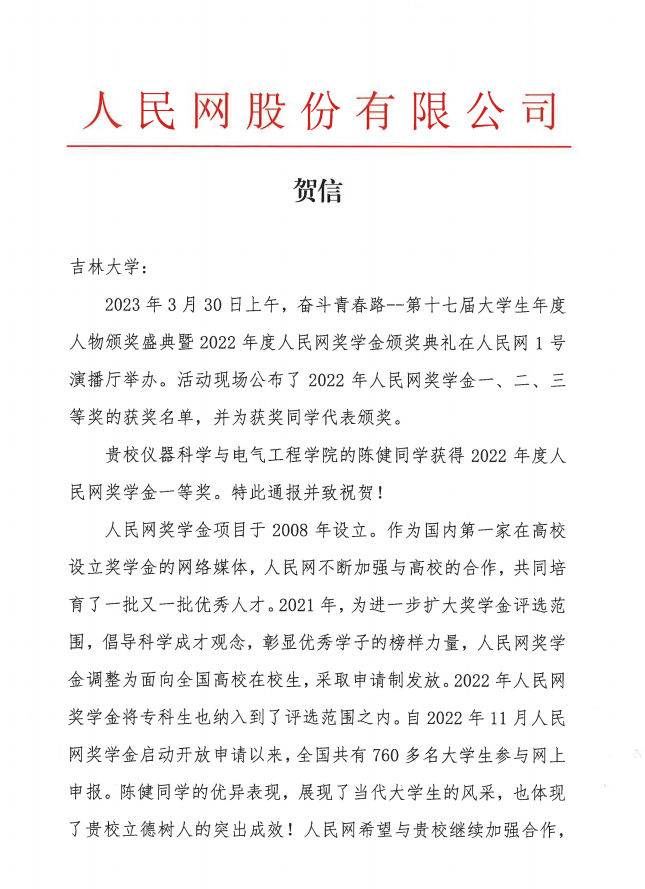 近日,奋斗青春路——第十七届老员工年度人物颁奖盛典暨2022年度人民网奖学金颁奖典礼在人民网1号演播厅举办。活动现场公布了2022年人民网奖学金一、二、三等奖的获奖名单,并为获奖同学代表颁奖。公司公司在读博士研究生陈健以全国总分排名第1的优异成绩获得2022年度人民网奖学金一等奖。