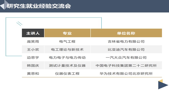 首先庞笑雨同学非常详细地介绍了选择国企的原因以及国家电网的相关部门,让大家对国家电网有了更深的理解,不再盲目的进入国企。接下来王小欢同学深入的和大家分享面试的技巧,告诉大家要明白自己的优势,坚定自己的目标,利用资源广泛关注在求职信息,重点关注就业网和各省的人事资源网。从高校、研究所、国企私企等方面告诉大家该如何准备。