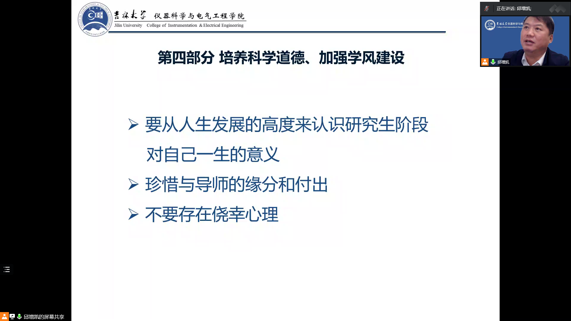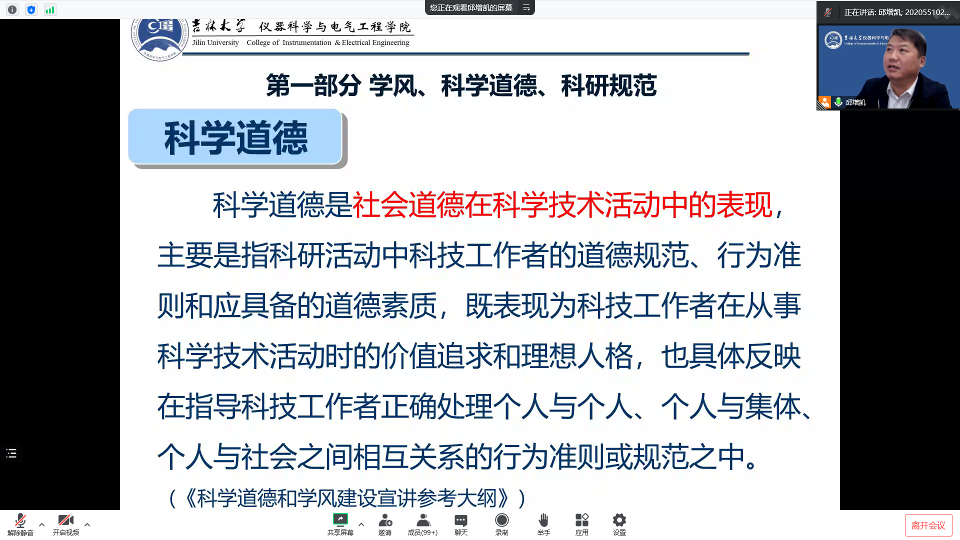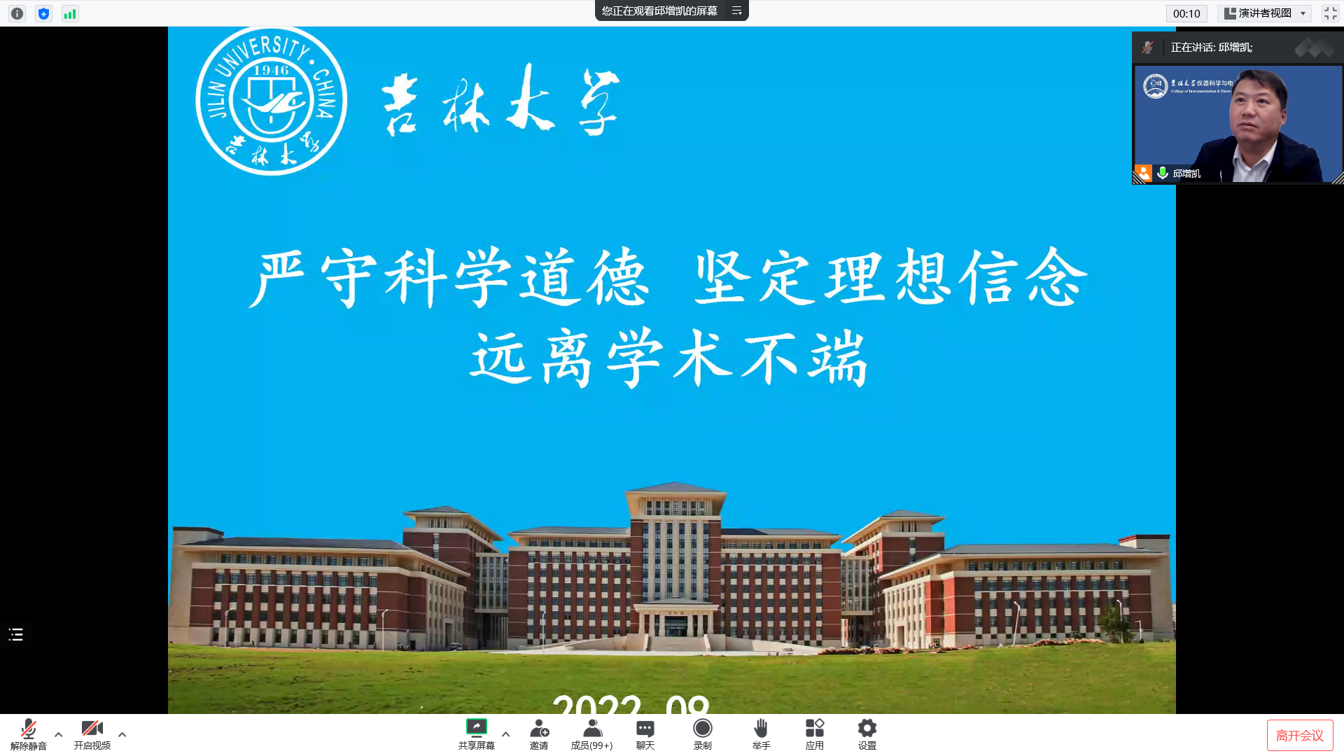 为进一步优化公司研究生学术诚信环境,增强研究生科学道德精神和学风自律意识,同时帮助2022级研究生新生尽快适应公司生活,尽早进入科研状态,365英国上市公司于2022年9月22日晚上18:00在线上腾讯会议组织开展以“严守科学道德,坚定理想信念,远离学术不端”为主题的学风建设讲座活动,活动由研究生辅导员周琪老师主持,党委书记邱增凯教授主讲,2022级博士、硕士研究生新生全体参加。