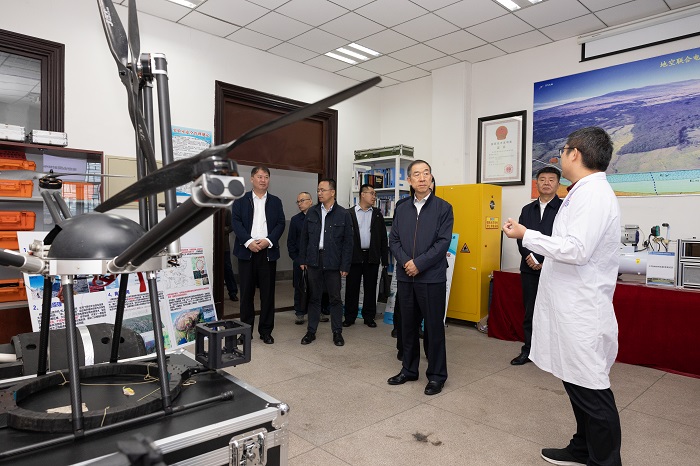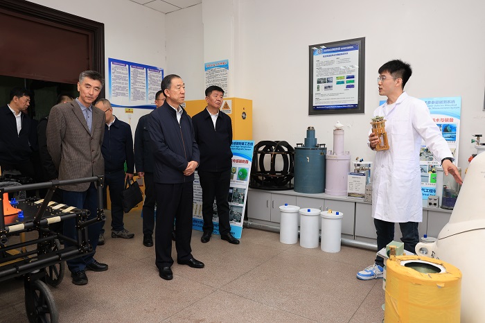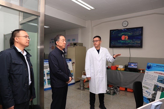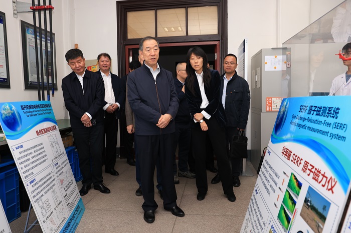 会见后,阴朝民一行在仪器科学与电气工程公司党委书记邱增凯、副经理林婷婷等陪同下参观了地球信息探测仪器教育部重点实验室,调研了公司自主研制的主动场磁共振探测仪、海洋电磁震源、超导全张量磁梯度测量系统、地震前兆气体光学检测设备、机载高分辨率电磁探测系统等,听取了公司研制的装备在复杂地质条件矿产资源勘察、水源性地质灾害隐患防治探测、电磁卫星地震前兆预测等方面的应用情况汇报。