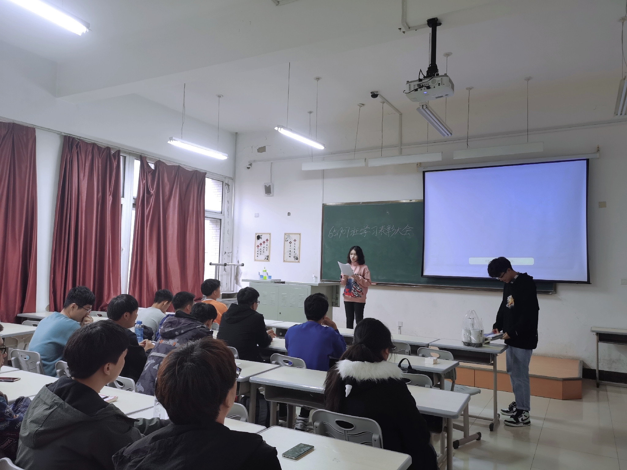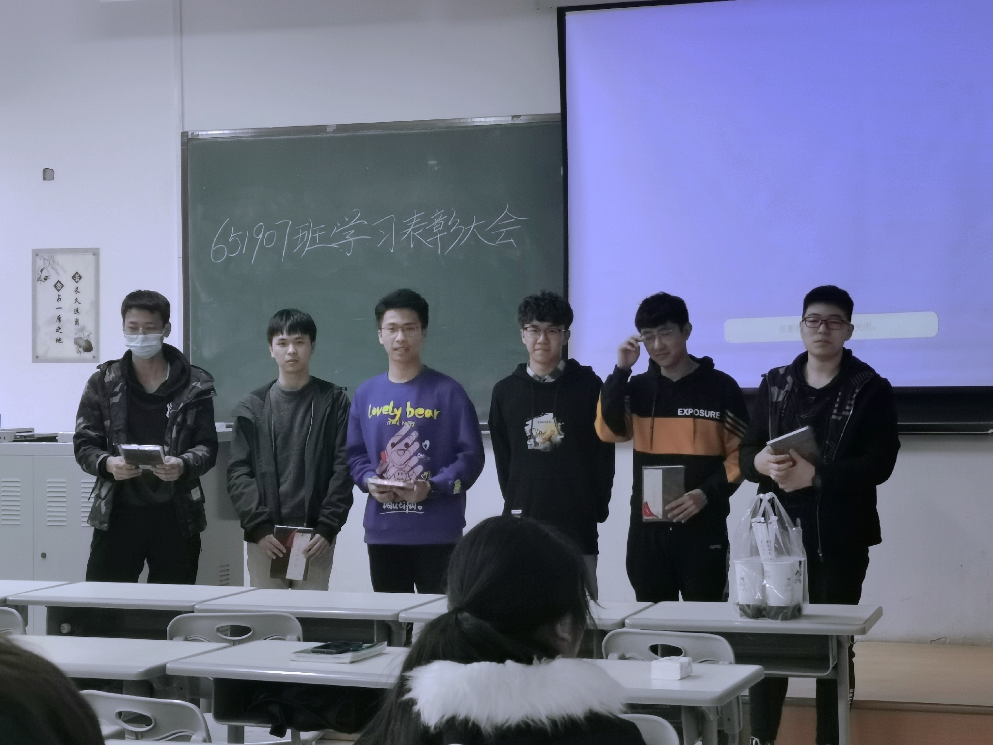 会议伊始,651907班班长王鑫宇同学肯定了近期同学们的学习情况,同时鼓励同学们再接再厉,勇登高峰。随后,主持人公布了优秀个人奖、优秀进步奖和优秀学习小组的获奖名单,获奖同学依次上台领取奖品并合影留念。颁奖结束后,优秀个人和优秀小组组长代表梁淦同学为大家分享了学习经验,并提出了学习小组内部“分科组长制”的意见,为今后学习小组的改革提供了新的思路。在同学们掌声和祝贺声中,本次班会圆满结束。