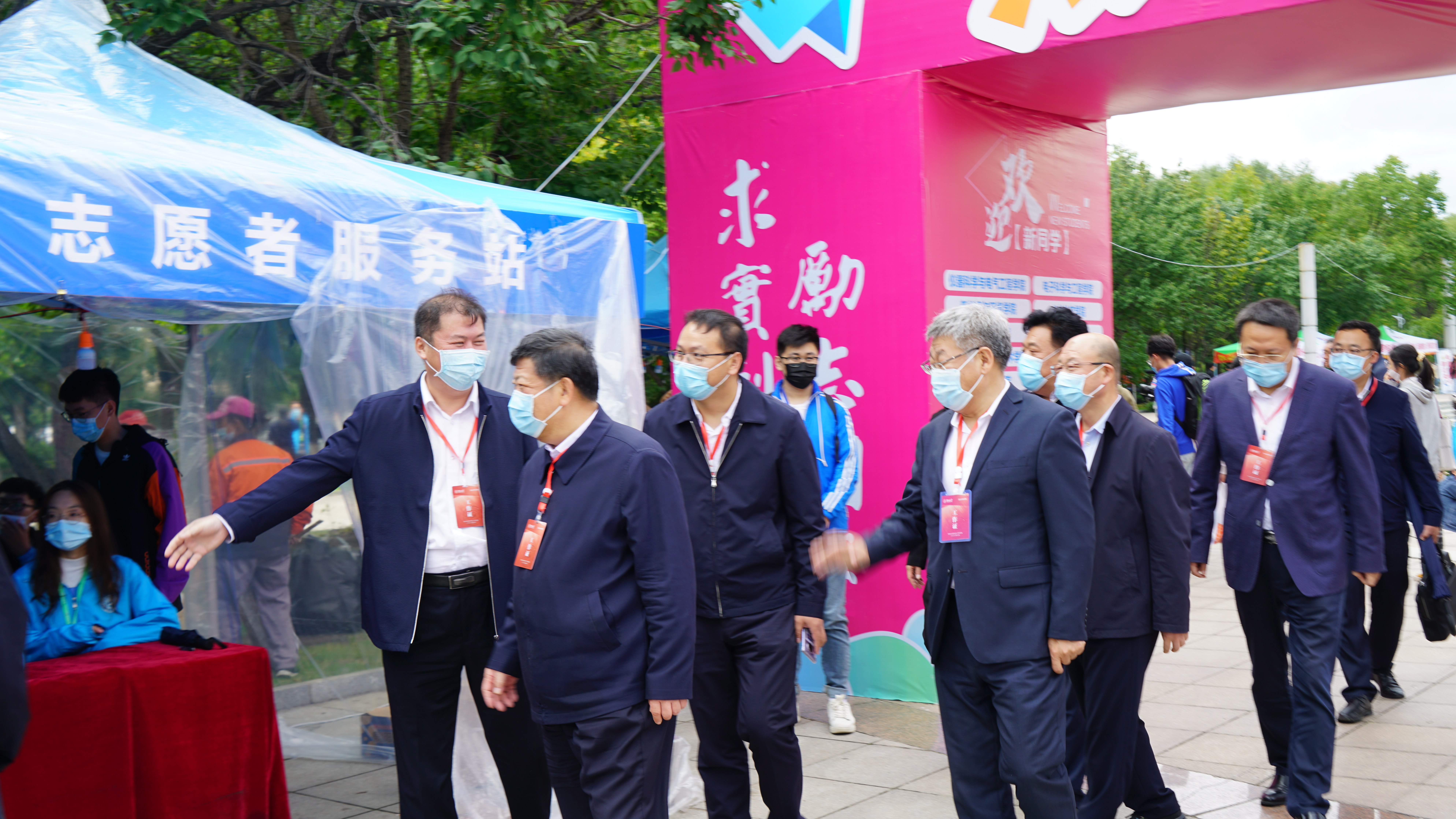 迎新现场有若干宣传海报,其中一张写有书记经理寄语,两张写着专业简介和​365英国上市公司简介,其余海报内容为新生名单。接待新生的前台设有以人脸识别设备为基础的身份确认岗位、一卡通及寝室钥匙发放岗位、银行卡激活办理岗位、生源地贷款岗位。公司迎新志愿者统一佩戴志愿者工作证,穿志愿者制服。另外,为配合公司防疫要求,在场所有人员全部要求佩戴口罩,新生排队报到时队伍需间隔一米以上。