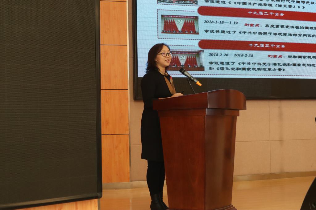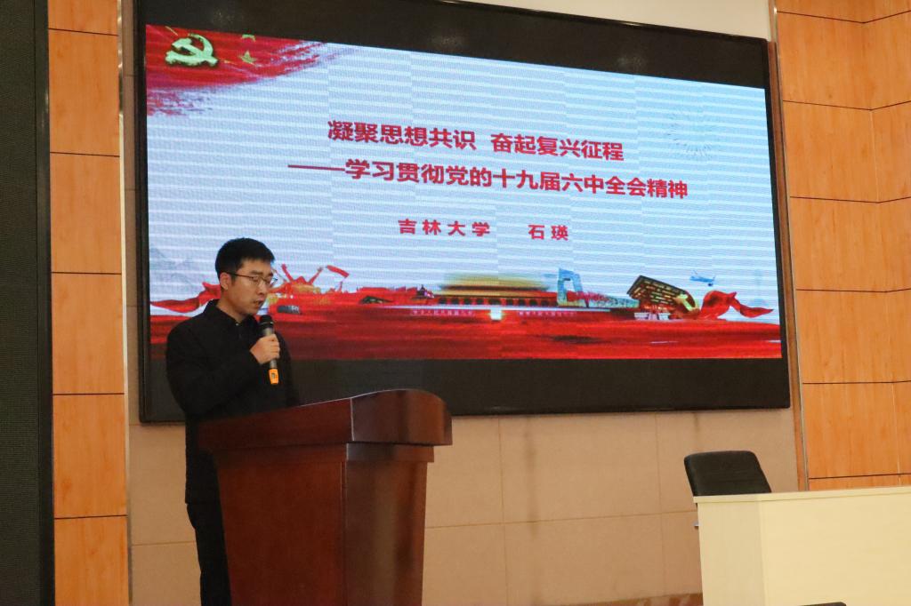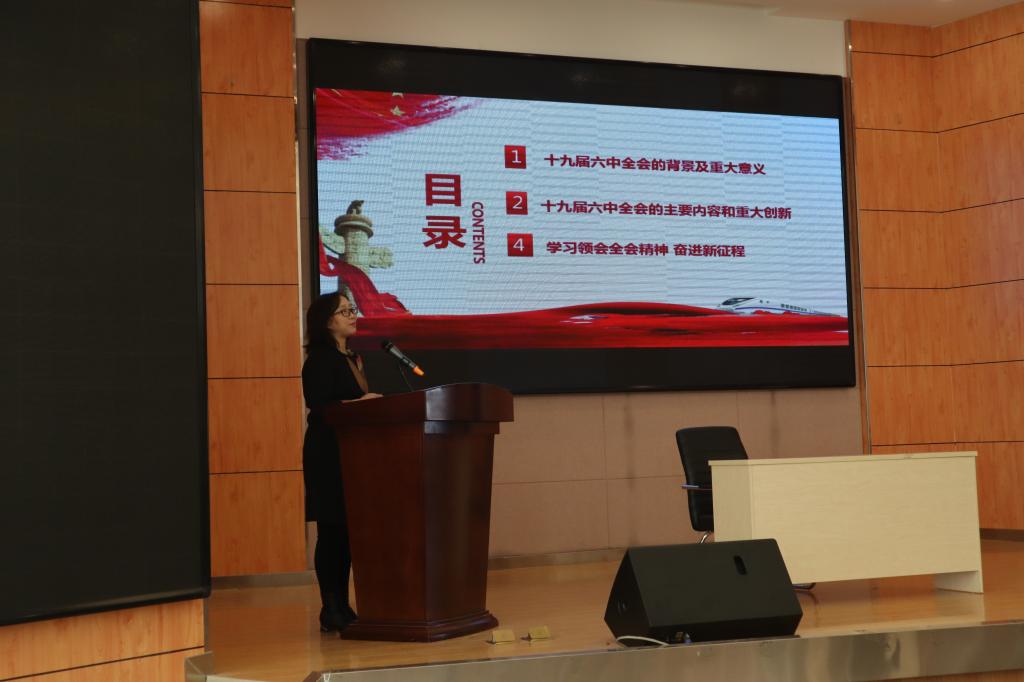 石瑛老师以“凝聚思想共识  奋起复兴征程”为主题,为全体师生详细解读了十九届六中全会召开的背景及重大意义,带领全体师生回顾了历次中央会议的决议。在讲解过程中,石瑛老师讲述了此次决议起草的重要原因与目标,让老师同学们更加深入了解了此次会议。在此之后,石瑛老师重点阐述了十九届六中全会的主要内容和重大创新,回顾了我党的百年奋斗历程,从历史到今天,我党经历了无数风霜雪雨,今天的伟大成就来之不易,阐明了此次十九届六中全会召开的重大意义。最后,石瑛老师号召同学们培养责任与担当意识,秉持中国共产党的根本宗旨,全心全意为人民服务,争做中国发展道路上的先锋梯队,为建设中国特色社会主义道路、实现中华民族伟大复兴的中国梦贡献自己的力量。