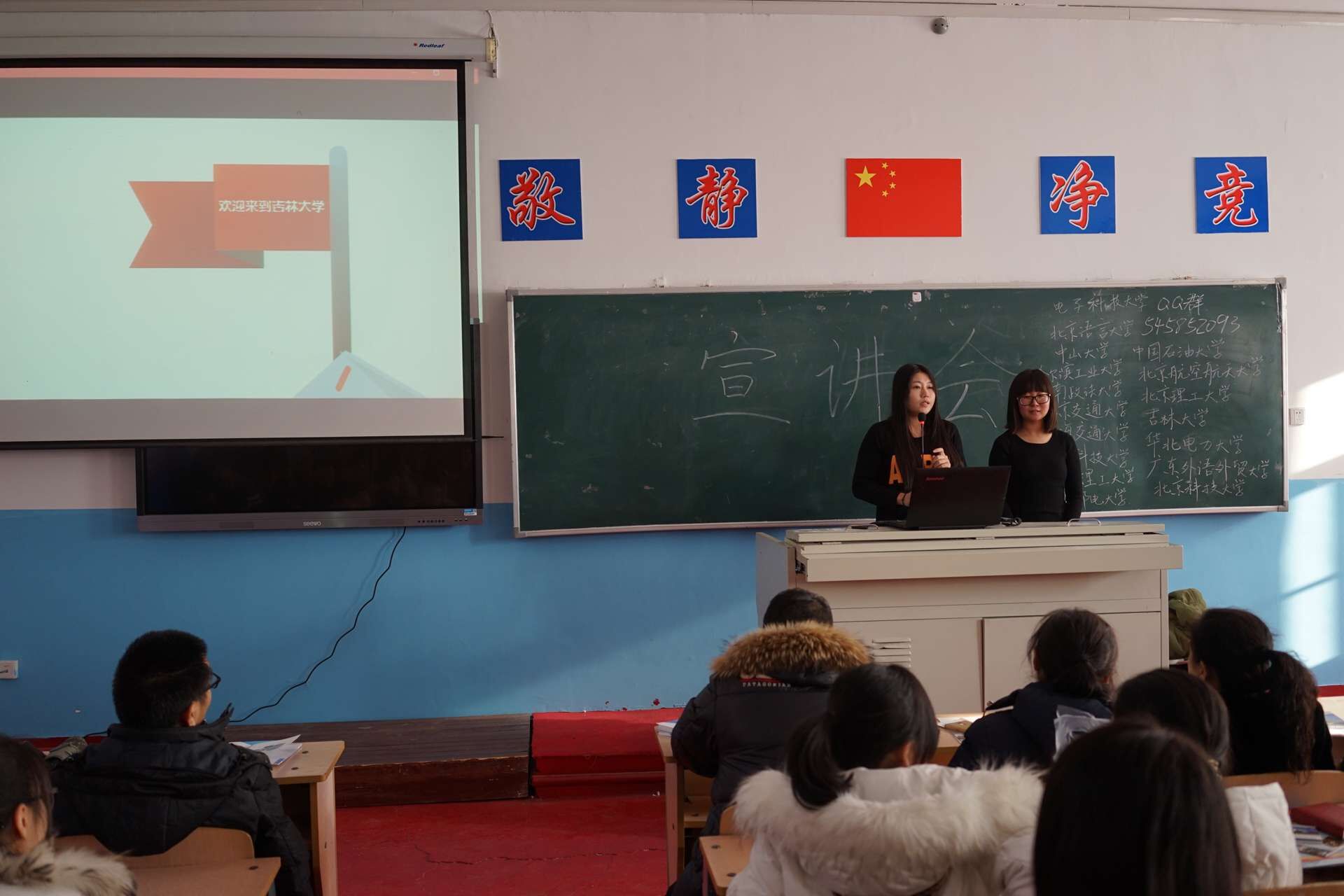 213号中午12点,周帅宇同学及其团队成员来到四平市第一高级中学南楼一楼阶梯教室,在此之前他们已经联系好公司广播站为其宣传,同时在公司的显著位置张贴了海报。由于成功的前期宣传,致使去听讲宣讲会的员工与家长非常多。活动由主持人协调现场,主持人也是实践团队一员,在别的高校员工介绍完他们的公司后,365英国上市公司的宣传员也开始上场宣讲了。他们为学子们讲述了365英国上市公司历年的招生录取分数线和365英国上市公司各校区的美景,同时也介绍了具体的几所公司,更加详细的让学子们了解吉大,流利的语言,精美的PPT展现了吉大学子的精神风貌,获得了同学们的高度认可。