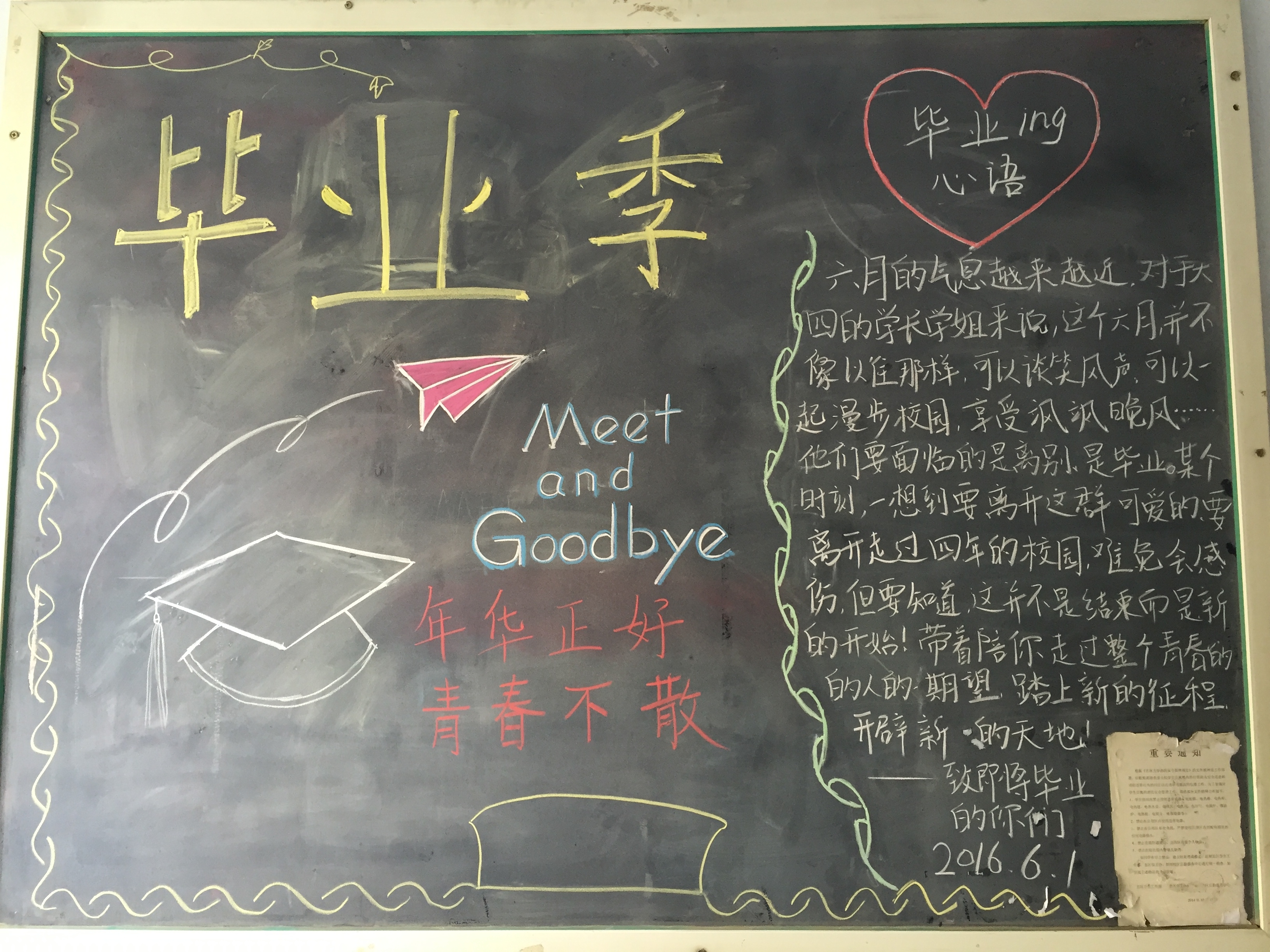 毕业季”黑板报美化了公寓环境,加强了校园文化建设,了学弟学妹们对即将毕业同学们真切祝福抒发了毕业同学们对校园的热爱与不舍。相信即将毕业的同学们能在未来的学习生活中再接再厉,创造出属于自己的辉煌!(365英国上市公司团委新闻通讯社 撰稿)