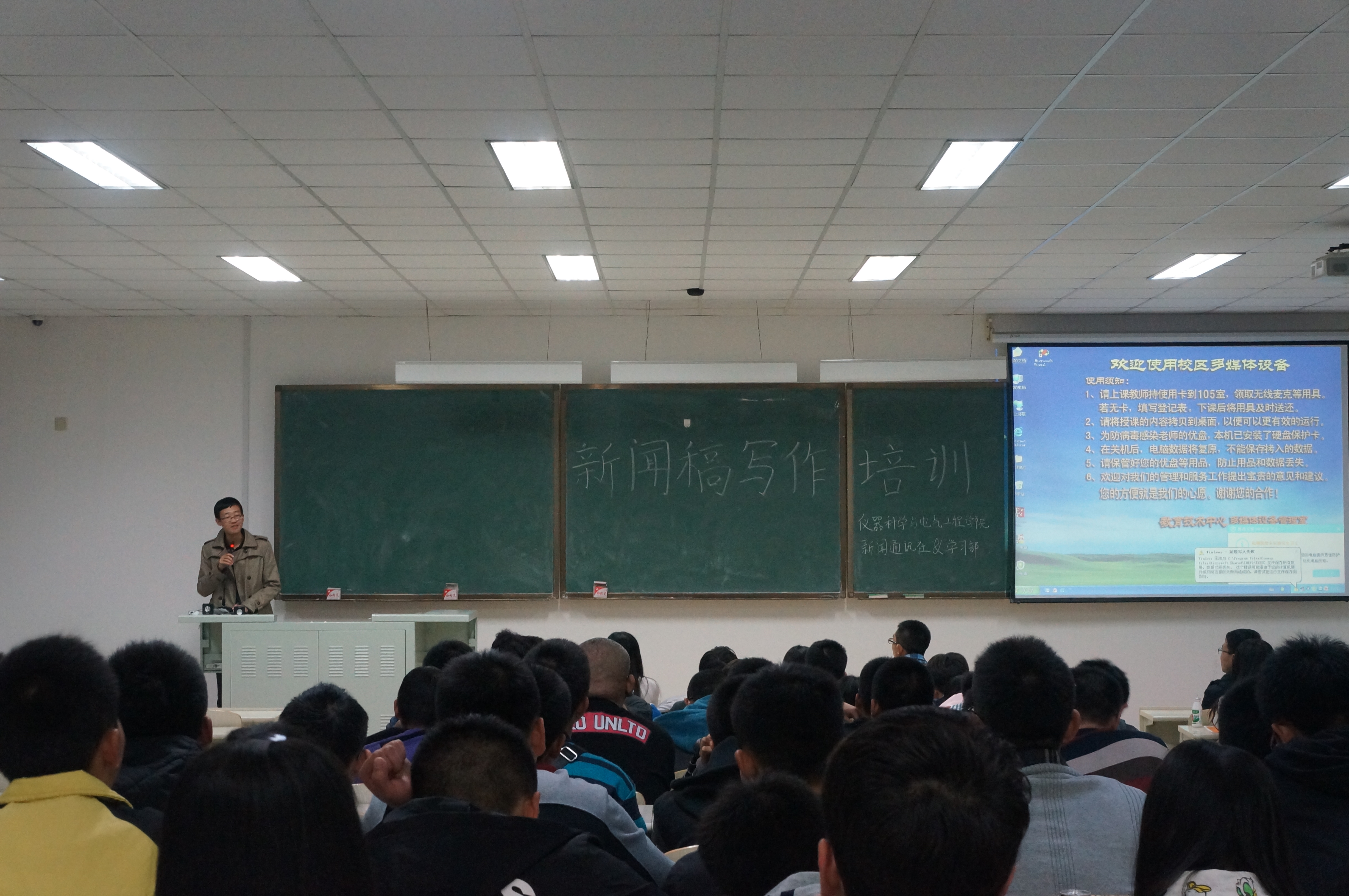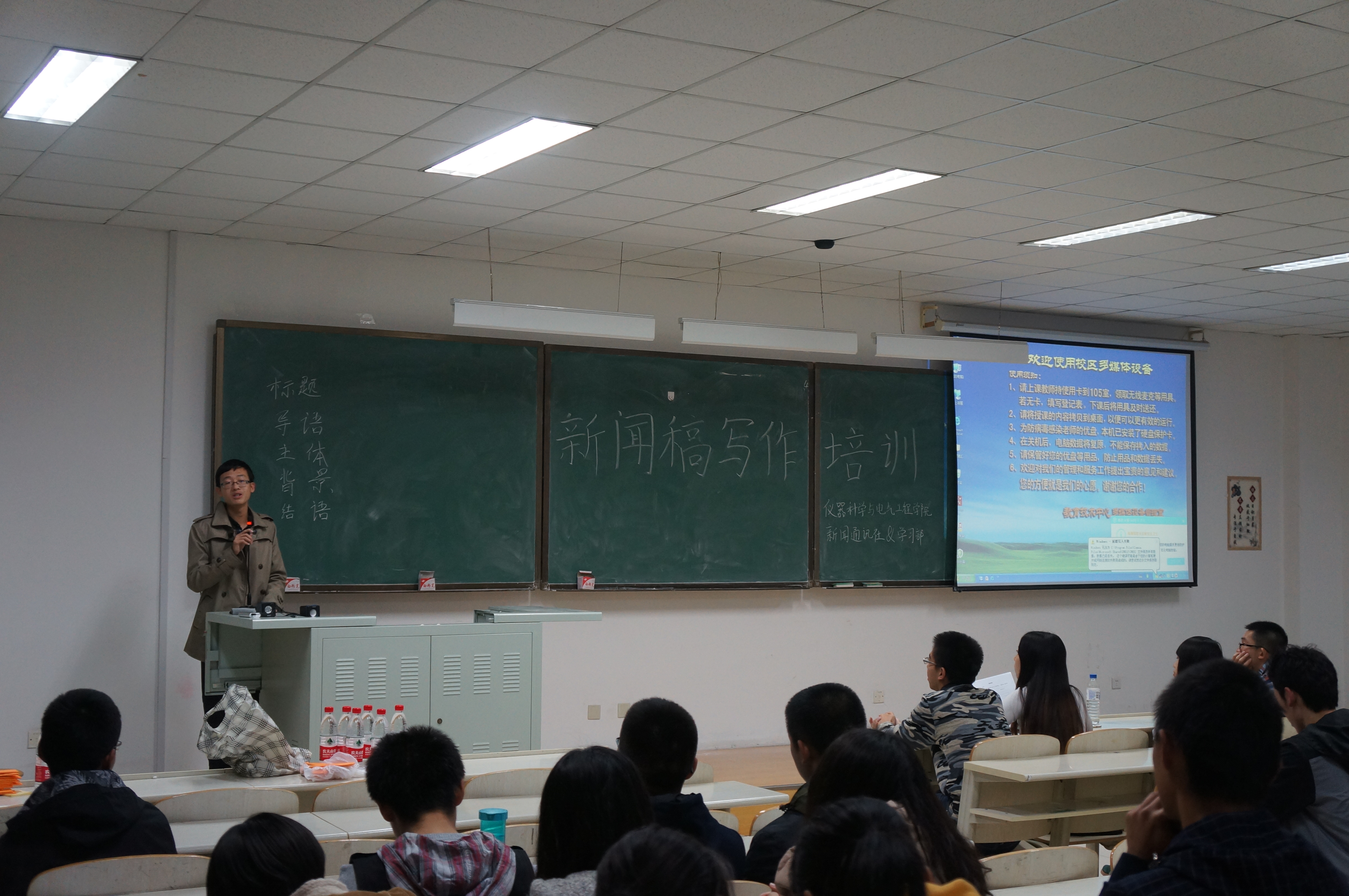 18:00整,新成员们准时来到李四光教学楼208室,培训活动很快拉开了序幕。活动开始,富有经验的新闻通讯社副社长陈乾向新成员们介绍了新闻稿写作的基本知识,包括新闻稿的五个结构,新闻稿的的格式要求,以及写作的多种技巧。新成员们认真仔细地边听边做着记录,并且还向学长学姐们积极地提出疑问;台上的学长学姐们生动幽默的讲解使现场的气氛温馨愉快。在现场浓厚的互动氛围中,新成员们与学长学姐积极地交流着写作的心得体会,培训活动在热烈的互动中渐渐落下帷幕。