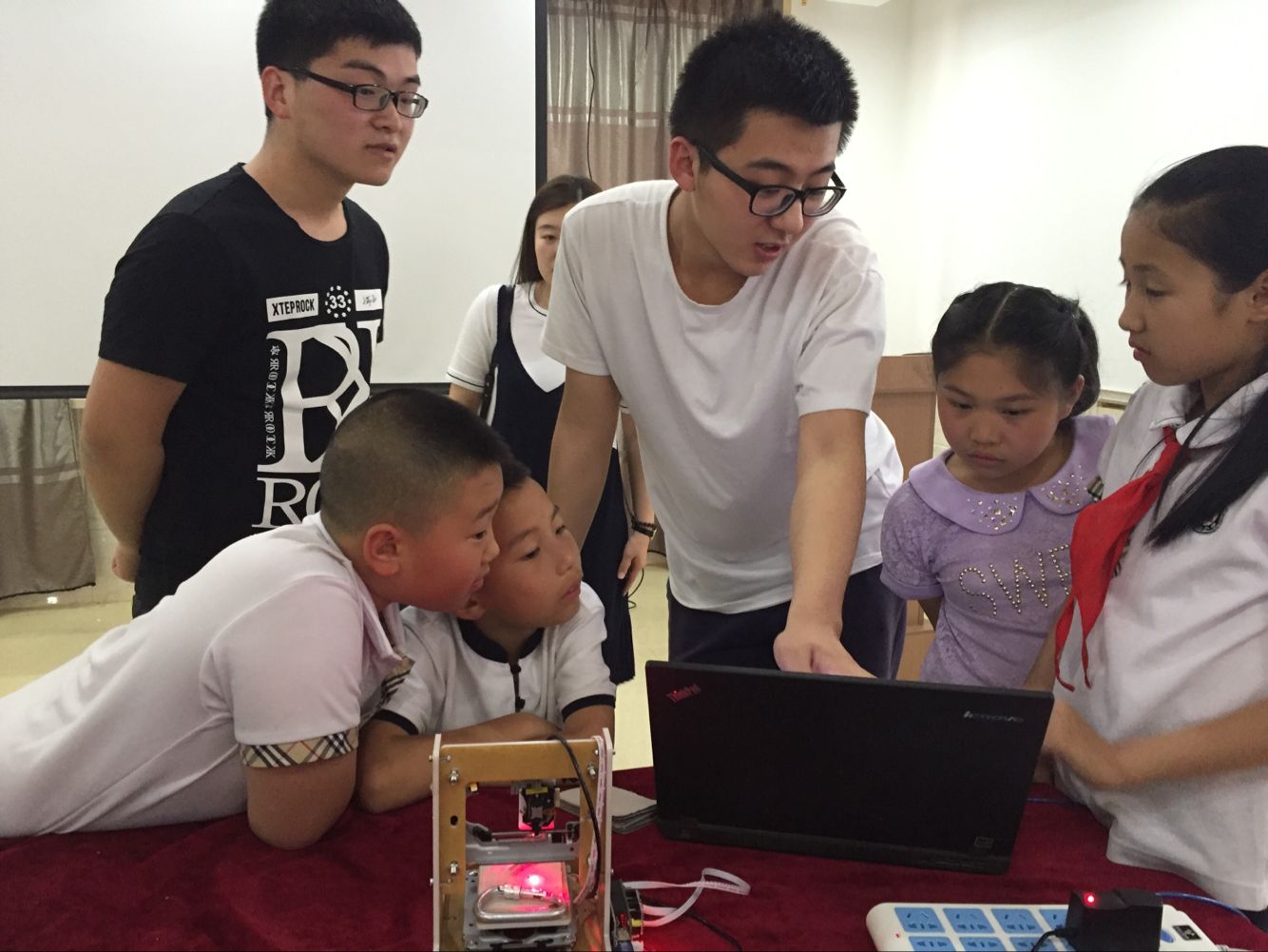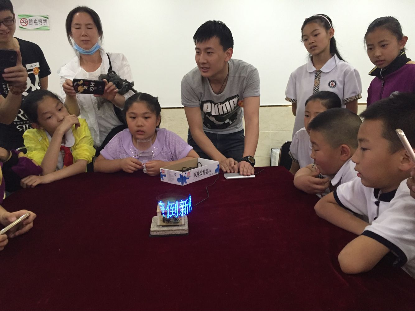 4月24日至5月24日,在活动的校园准备期间负责人袁锦烽悉心督促22组志愿者自主完成电子产品的设计5月25日晚6点,由老员工科技创新协会会长李冰洋组织进行优秀作品的评分筛选,志愿者们热情高涨的展示介绍自己的电子作品。5月27日,为了喜迎六一儿童节的到来,志愿者们走进西朝阳社区,与孩子们互动,向孩子们讲解科技作品原理。垂直led旋转屏趣味性强,与孩子们产生了良好的互动,大家纷纷写下自己的名字并通过旋转的屏幕展示出来;激光竖琴让有音乐天赋的孩子大显身手,动听悦耳的琴声在空气中洋溢着,小孩子们情不自禁地鼓起了掌,家长也点头称赞;六足避障机器人也让孩子们动起手来,每成功避开一个障碍物,孩子就发出兴奋的笑声,热闹非凡。与此同时,负责人也与社区书记和家长们进行了愉快的交流。