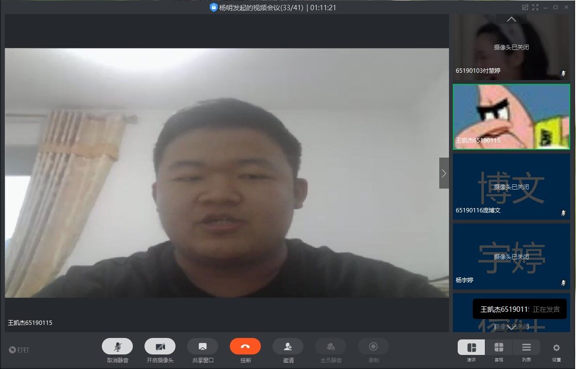 期末在即,为帮助同学们在疫情期间树立正确的学习态度,解决同学们的学习困难,掌握适合自己的学习方法,培养良好的学习习惯,651901班于2020526日晚1930利用钉钉直播开展“仪电少年,‘疫’起学习”主题班会,本次班会由班长杨明主持,并邀请到651901班班主任王智宏老师、郑凡老师以及辅导员马姗姗老师出席班会。